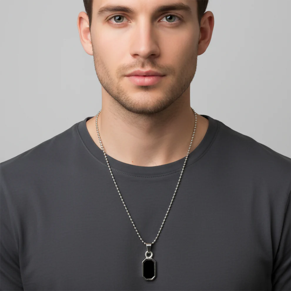 Make a strong style statement with this octagon black pendant necklace for men, crafted for those who appreciate modern geometric jewelry with a minimalist touch. The pendant features a sleek black inlay that contrasts beautifully with its polished silver-toned frame, creating a bold yet refined look.